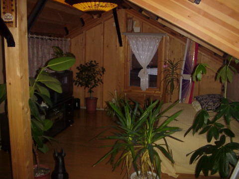 書斎の反対側(北側)は写真では見 づらい かも知れませんがDVDを ホームシアター で楽しめる様にし ています。 ソファーベッドに横たわりながら DVDを見たり、音楽を聴くのは1日 の疲れがとれていいですよ。 広さは10畳くらいですね。 観葉植物がいっぱいあるので気持 ちが休まり ます。 |