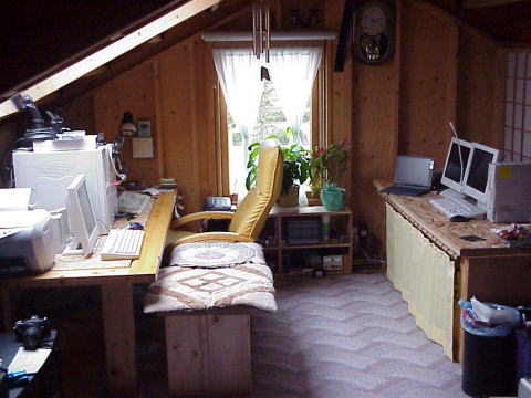 | 机の大きさは畳1畳半あります。 この机が左右に一つずつあり、左が パソコン用で右がアマチュア無線や ラジコンなどをいじる時の作業台 です。 贅沢ついでに言わせてもらうと、 天井裏なのでちょっと天井が低いこと くらいですね。 全て木貼りで、壁紙など一切使って いないので夜にはランプに火を灯すと まるで山小屋に居るようです。 |