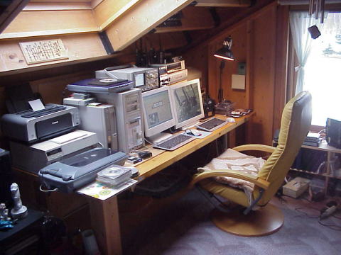 | 私の書斎は屋根裏部屋にあ ります。 廊下の天井にある折りたたみ式 階段を下ろして上るとそこは子供達 には入って来れない私一人の空間です。 広さは約8畳くらいでしょうか、自作 の机が大きすぎてなんだか狭く 感じます。 都会のお父さんにはちょっと贅沢に 見えますね。 |