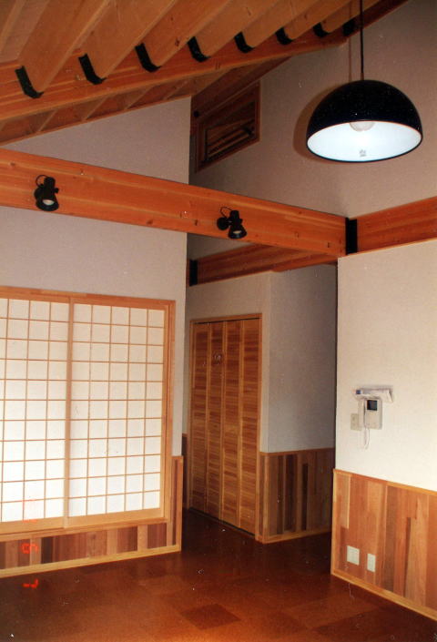 ロフト以外の壁は、石膏塗りの現し壁になっており、下側には杉の木が貼ってあります