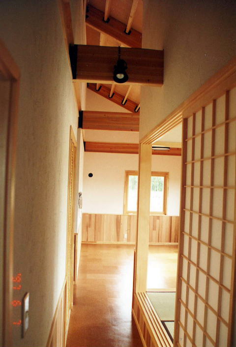台所へ通じる廊下からリビングを眺めた写真です リビングは吹き抜けになっていて平屋建てとは思えないくらい 広く感じます |