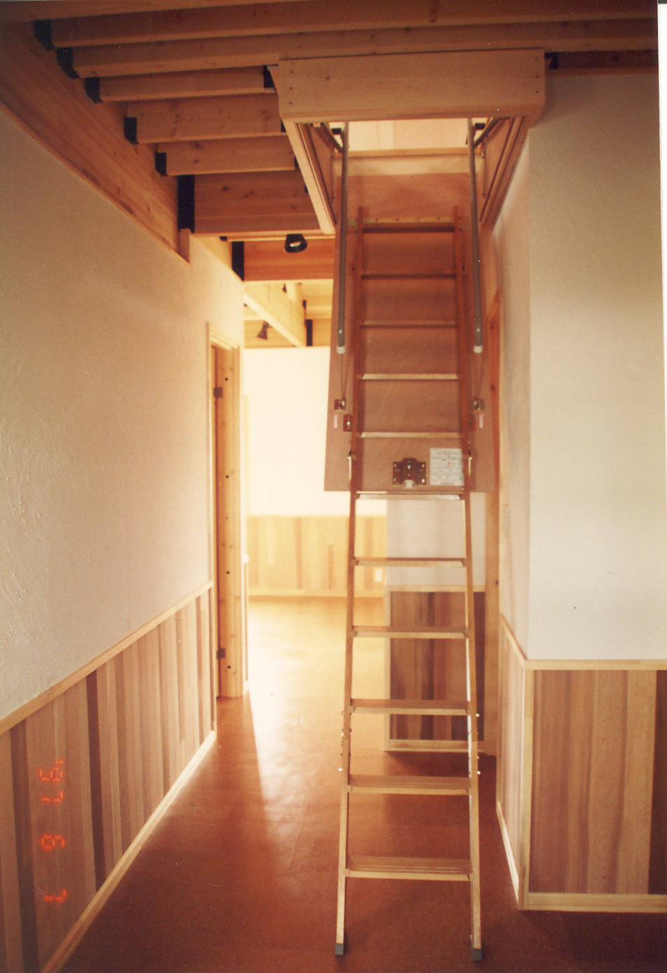 | 廊下の天井にある折りたたみ階段を下ろし ロフトに上がります 利用しないときは収納できるので 階段に場所をとられません |