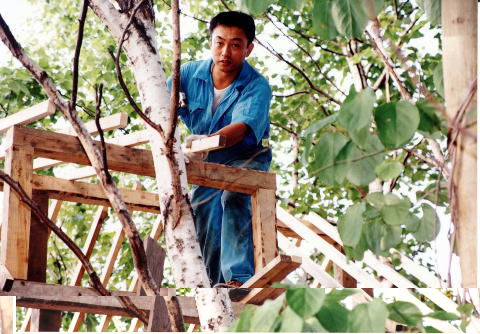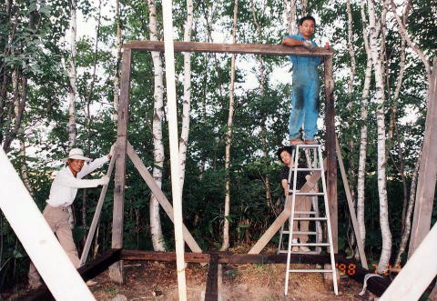 柱の垂直はひもに重りを吊るして計るという原始的な方法で立てています。