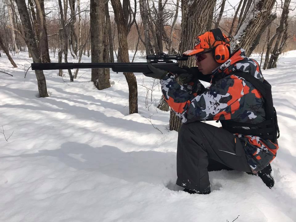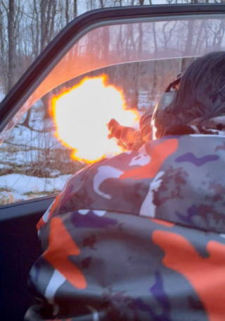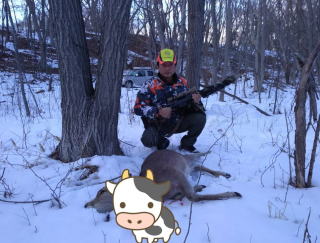 鹿猟での発砲の瞬間です。メス鹿が獲れました。